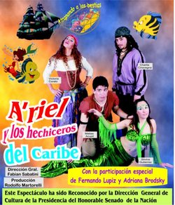 A’riel y los hechiceros del caribe, es una divertida comedia musical en donde actores, canciones, títeres (Nemo y Dory), juegos y muñecos (personajes Backyardigans) , están combinados en teatro tradicional y teatro negro.