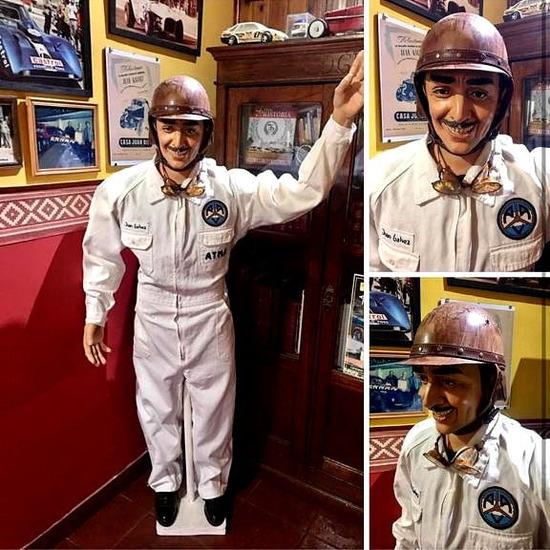 Escultura de Juan Gálvez tamaño natural con mameluco y insignias casco de la época y antiparras.