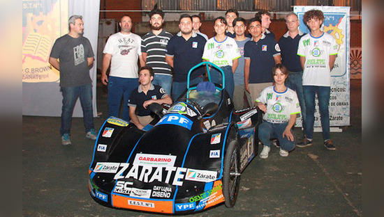 Alumnos técnicos zarateños junto a un auto del Desafío ECO de YPF.